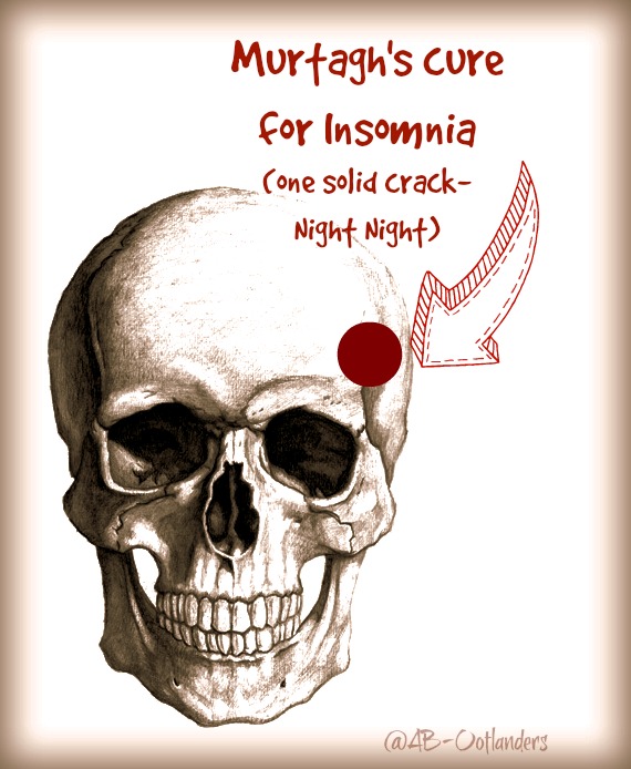 Off go the fearsome foursome to save the damsel in distress. Murtagh, Rupert, Angus & Jamie. These are four dudes you do not want to meet in a back alley somewhere. They took a whole garrison in one fell swoop! Murtagh and his nighty night cracks to the noodle. Which he is probably known for in the Highlands. “Och, yer havin trouble sleepin? Aye, go visit Murtagh…ye’ll not feel a thing”skull